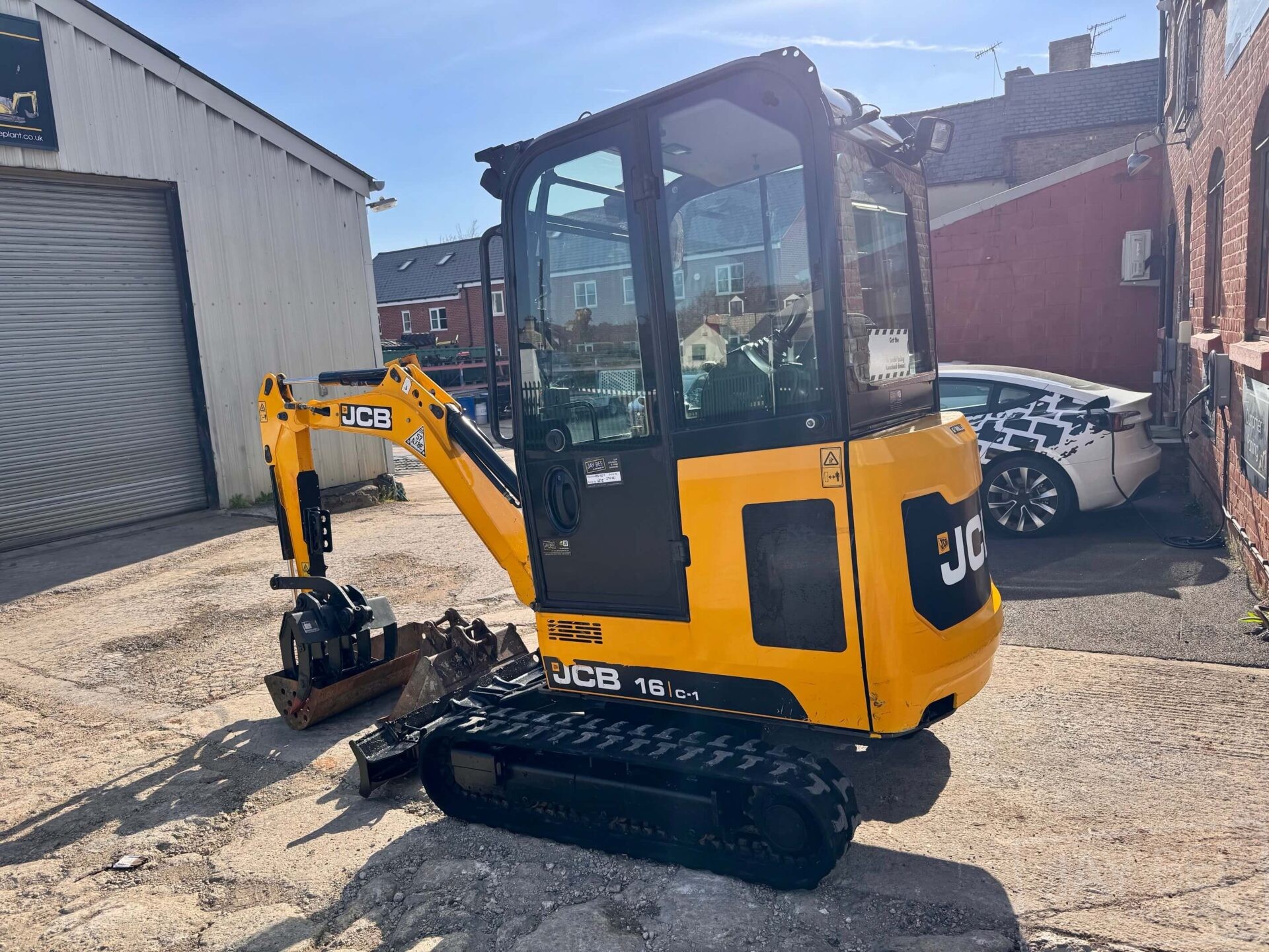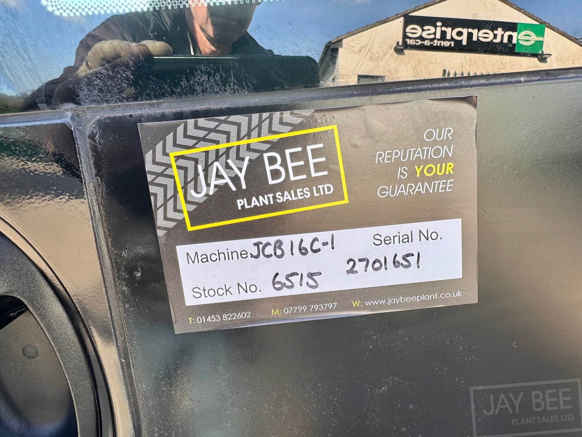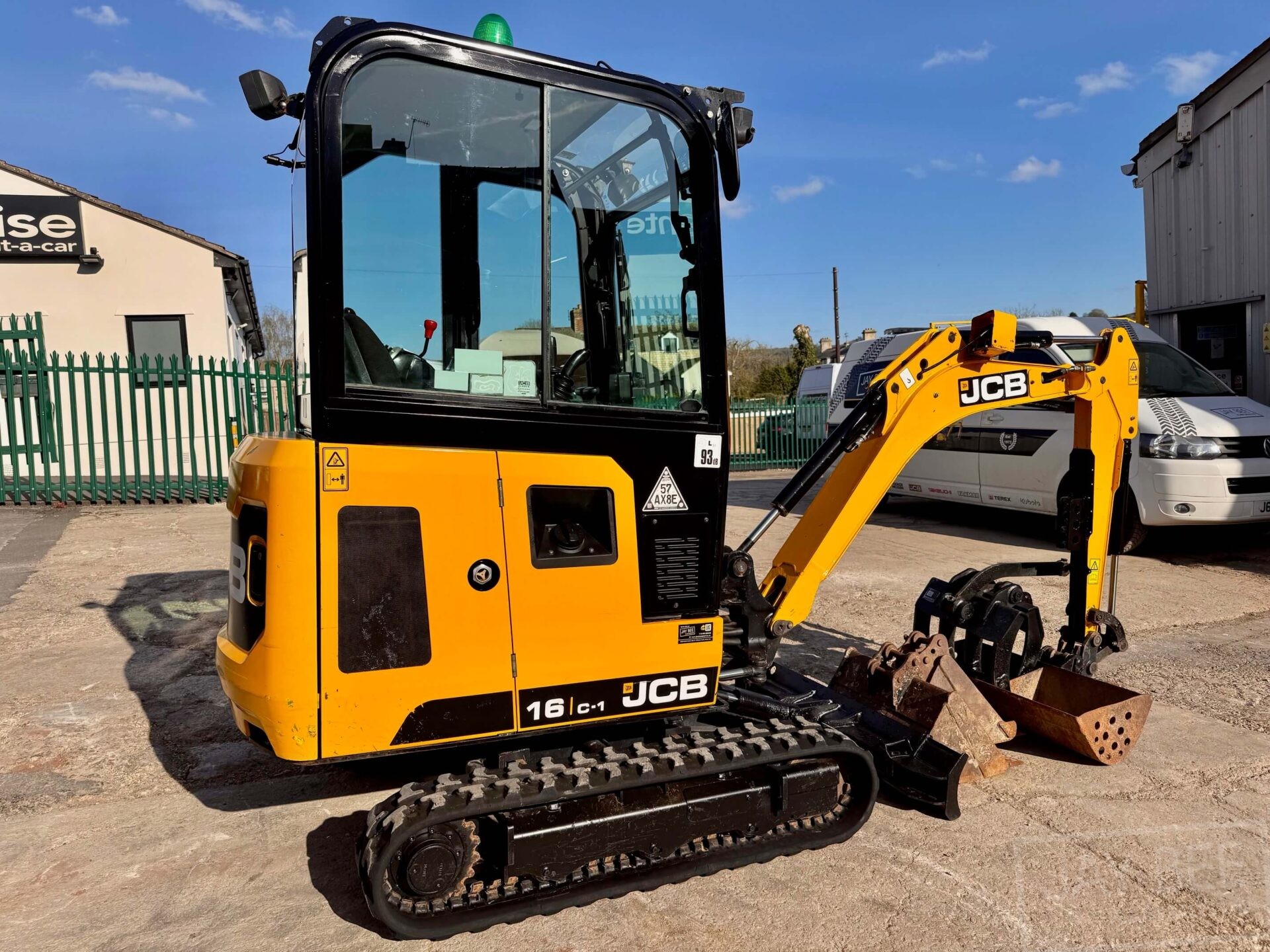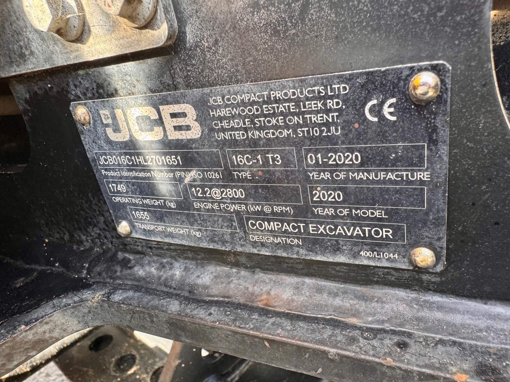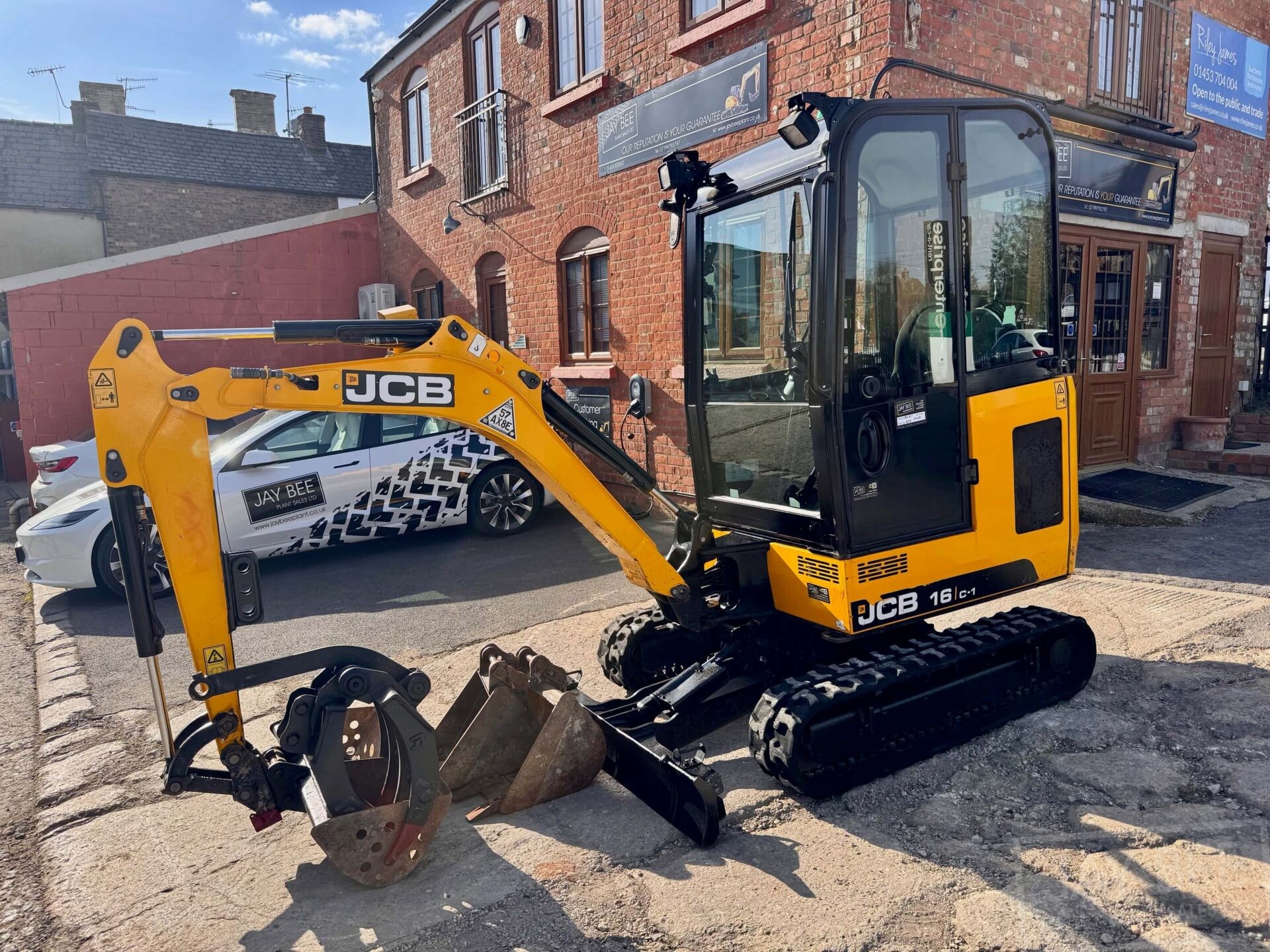 2020 JCB 16C-1 excavator with quick hitch & 3 buckets plus mechanical grapple. Full cab model with heater. 2 speed tracking and expanding undercarriage.