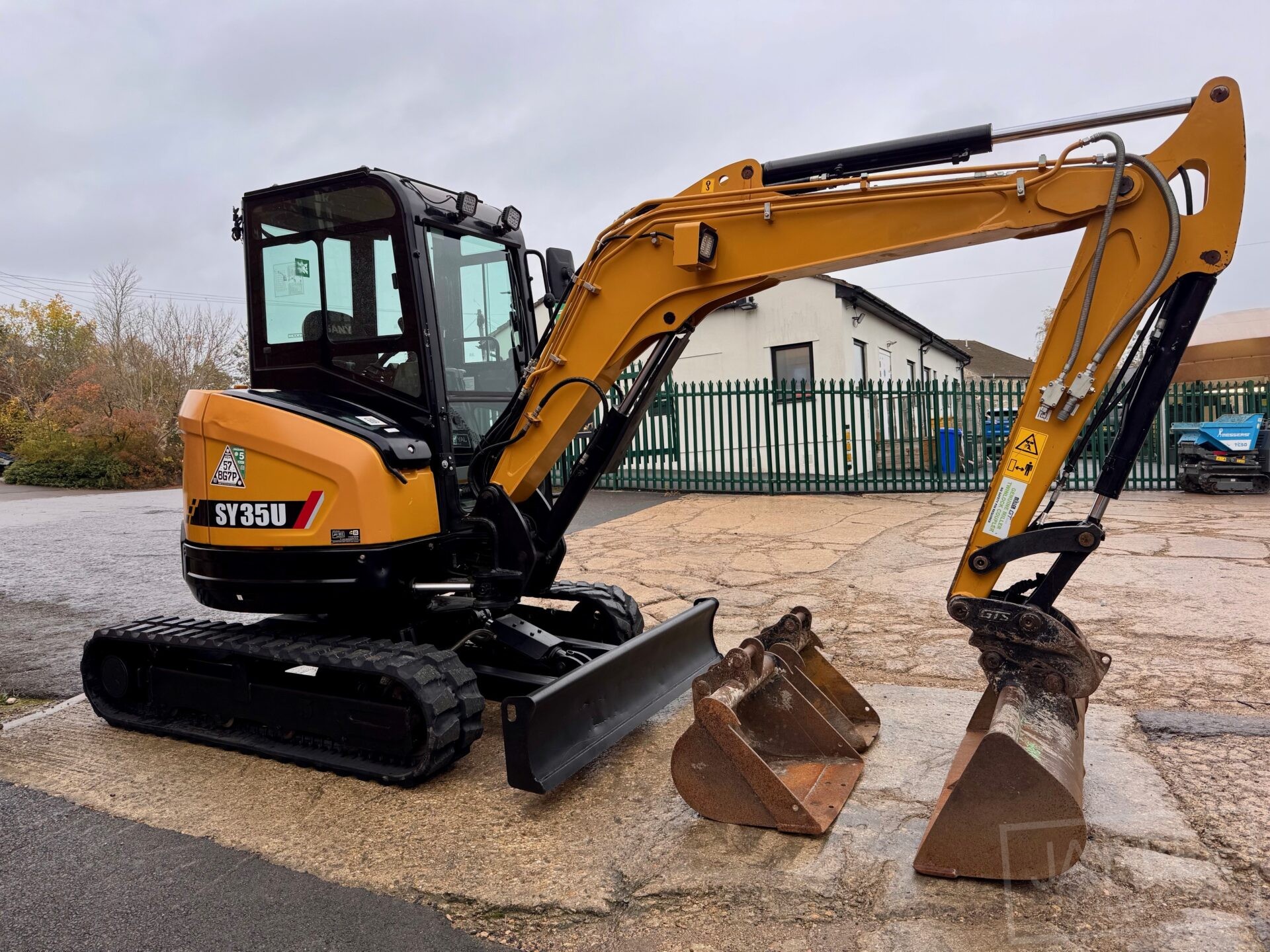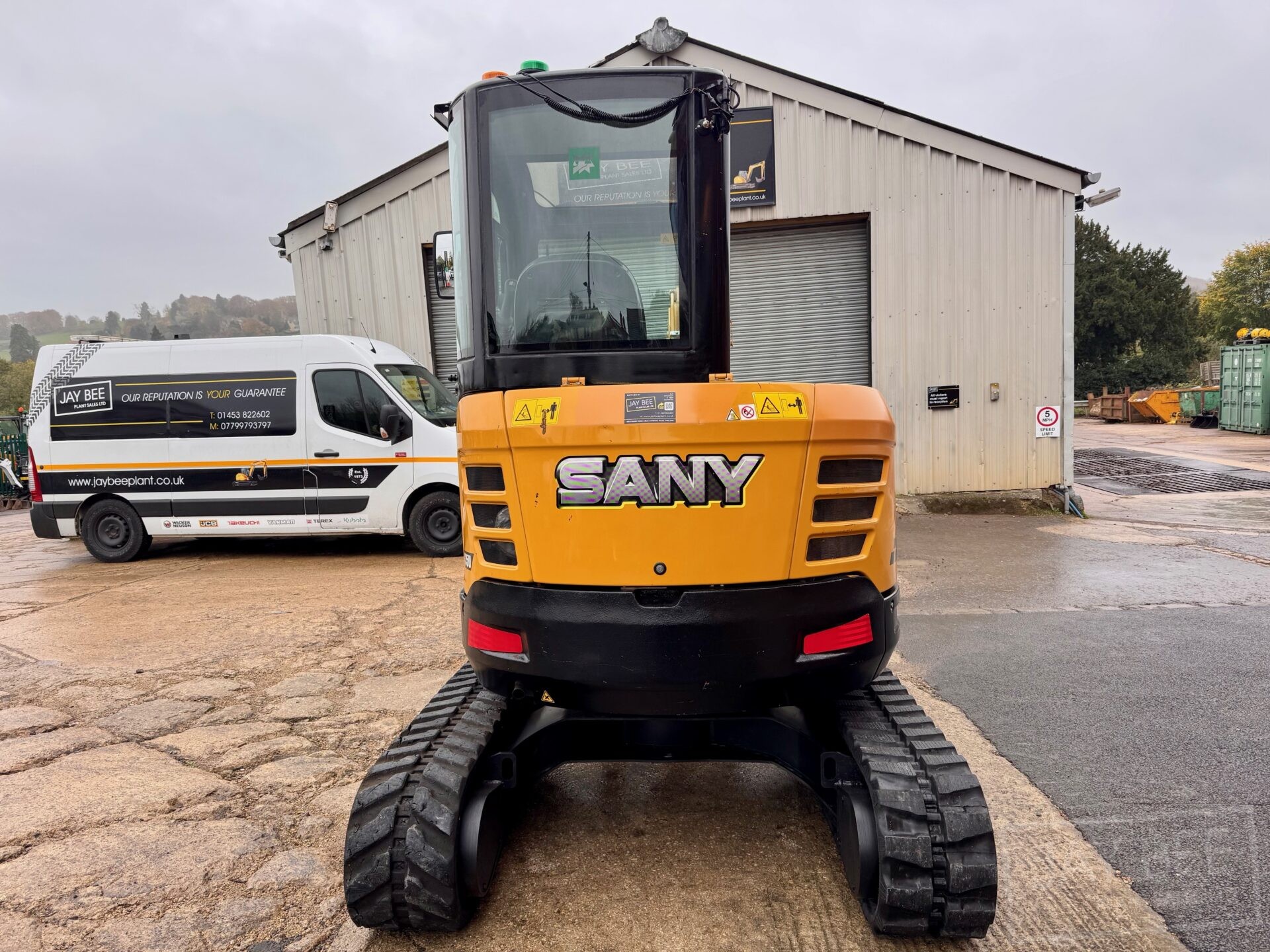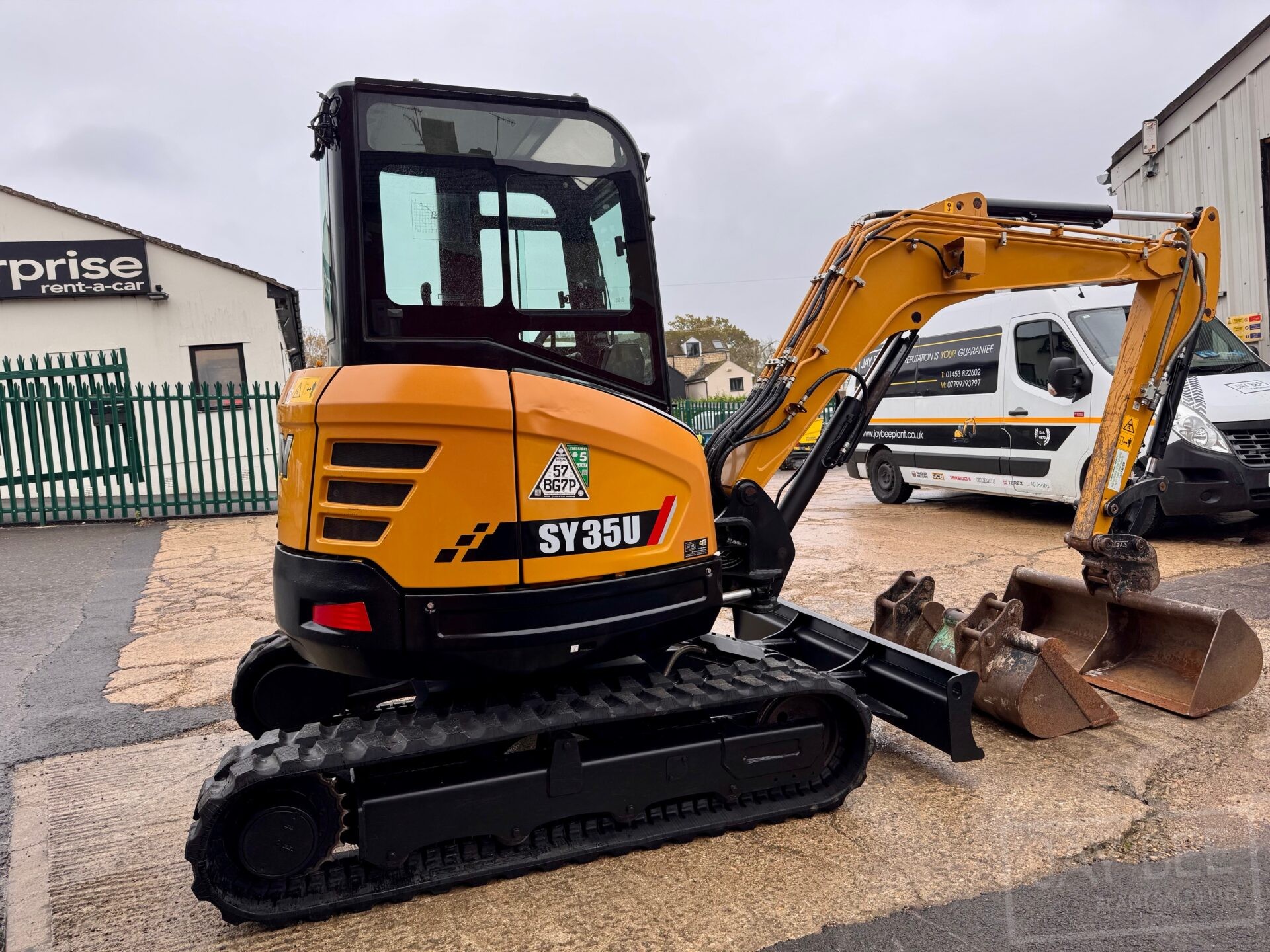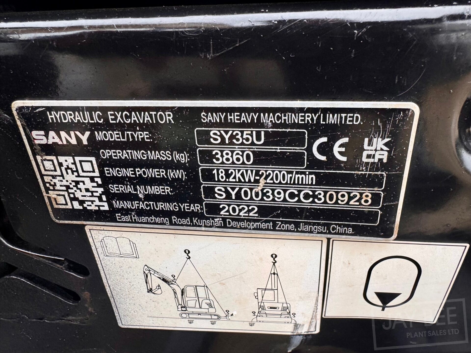 2022 Sany SY35U excavator with hydraulic quick hitch & 3 buckets, zero tail swing with auto idle, air con and piped to take rotating grab.