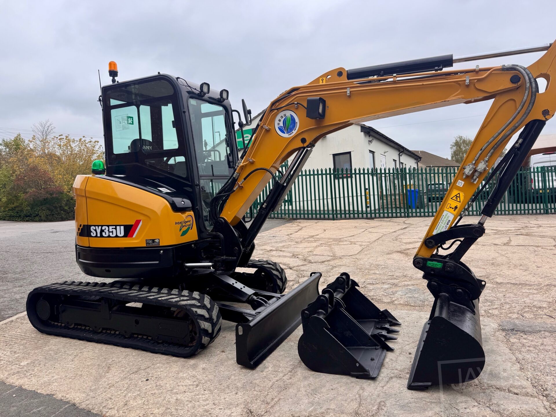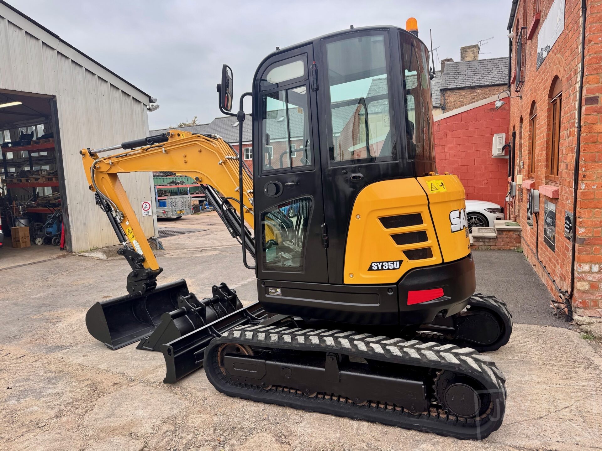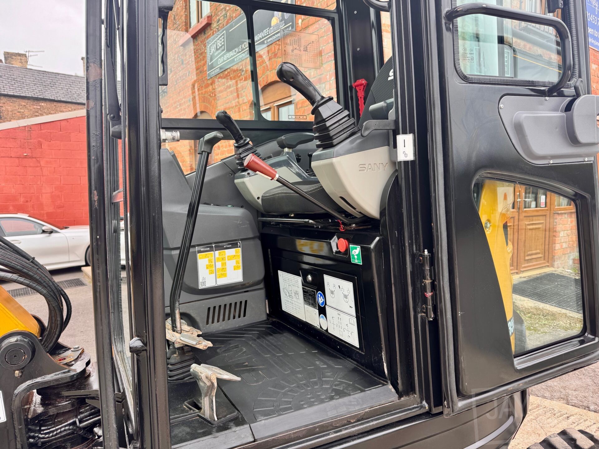 2022 Sany SY35U excavator with hydraulic quick hitch & 3 buckets, zero tail swing, auto throttle, air con and piped to take rotating grab.