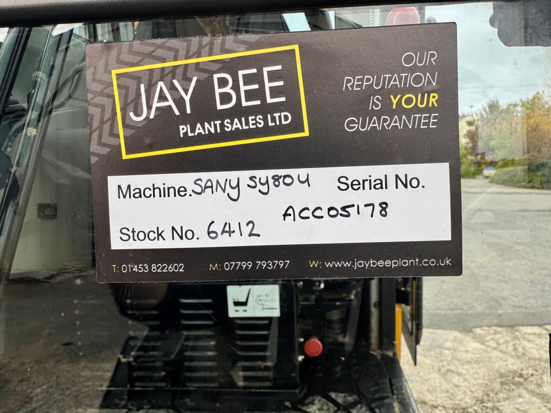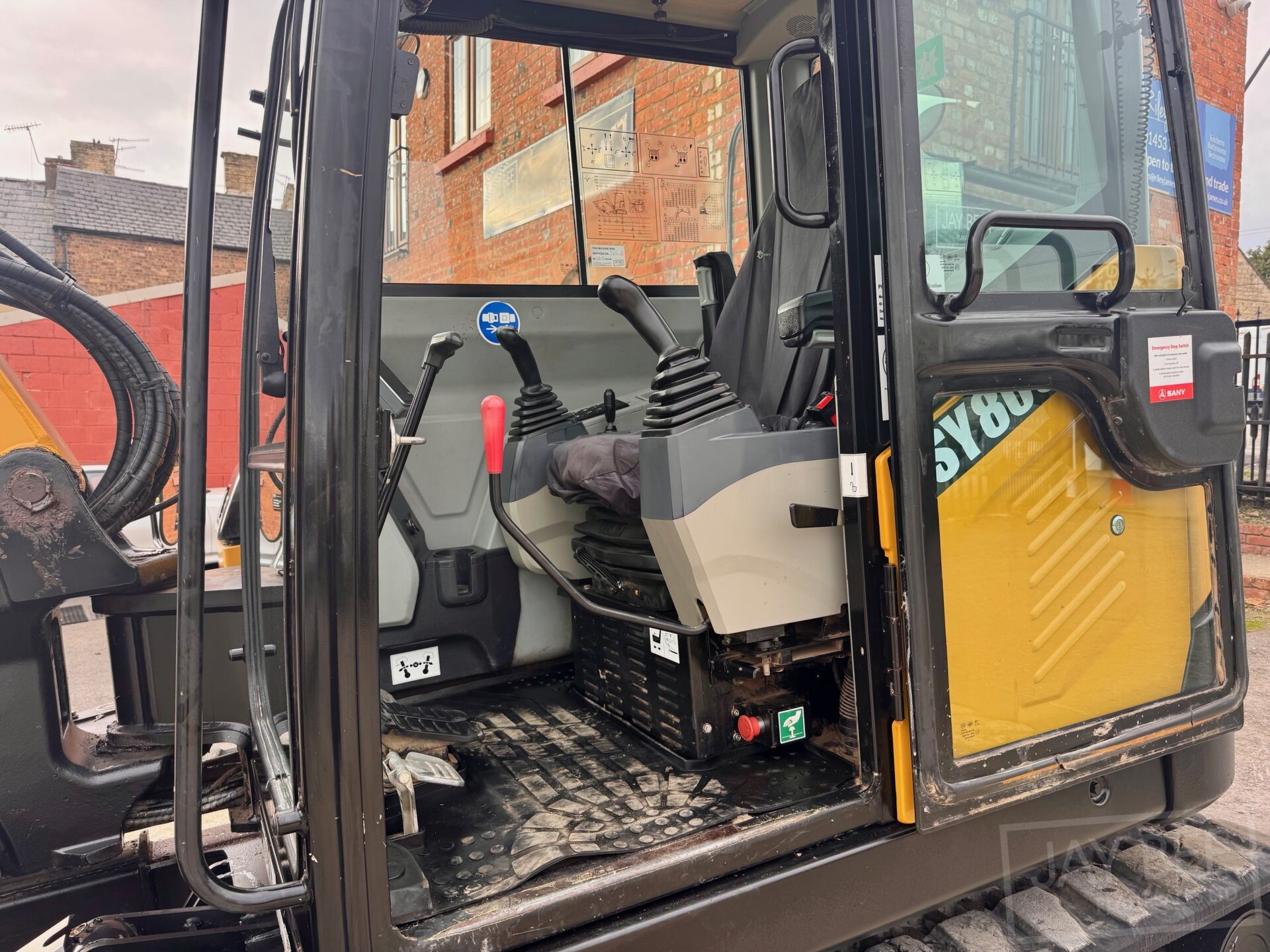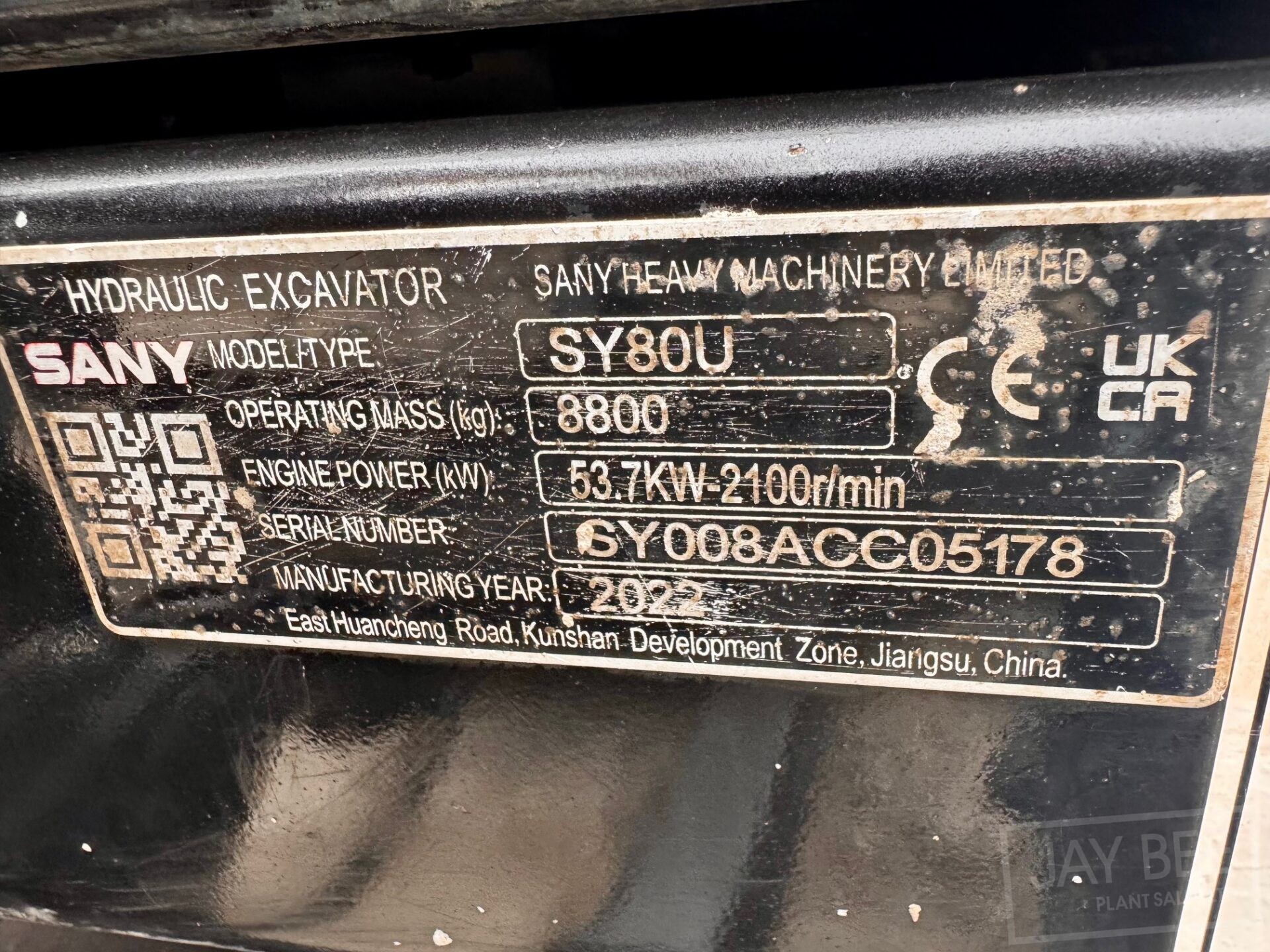 2022 Sany SY80U excavator zero tail swing with hydraulic quick hitch & 3 buckets including a new grading bucket.