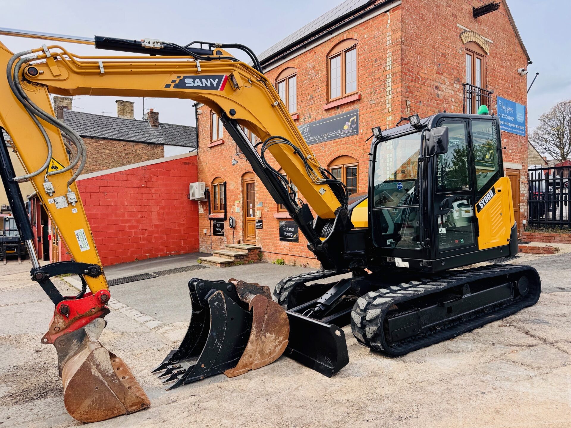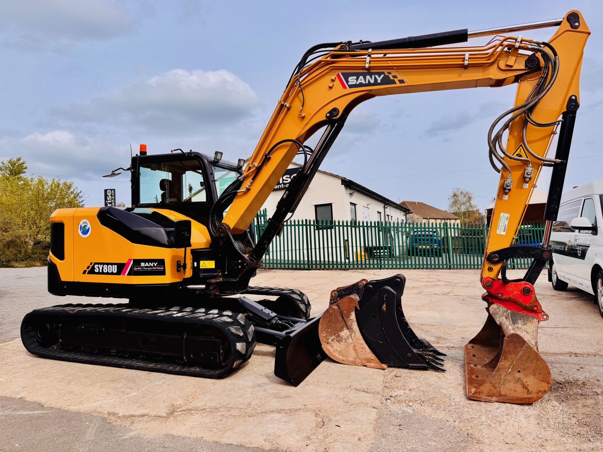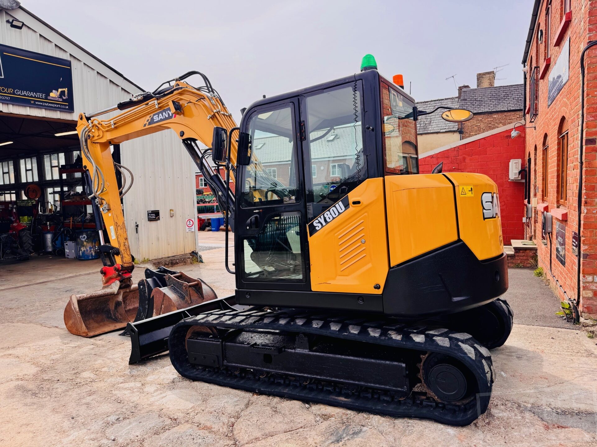 2022 Sany SY80U excavator with hitch & 3 buckets, zero tail swing model piped to take rotating grab, air con.