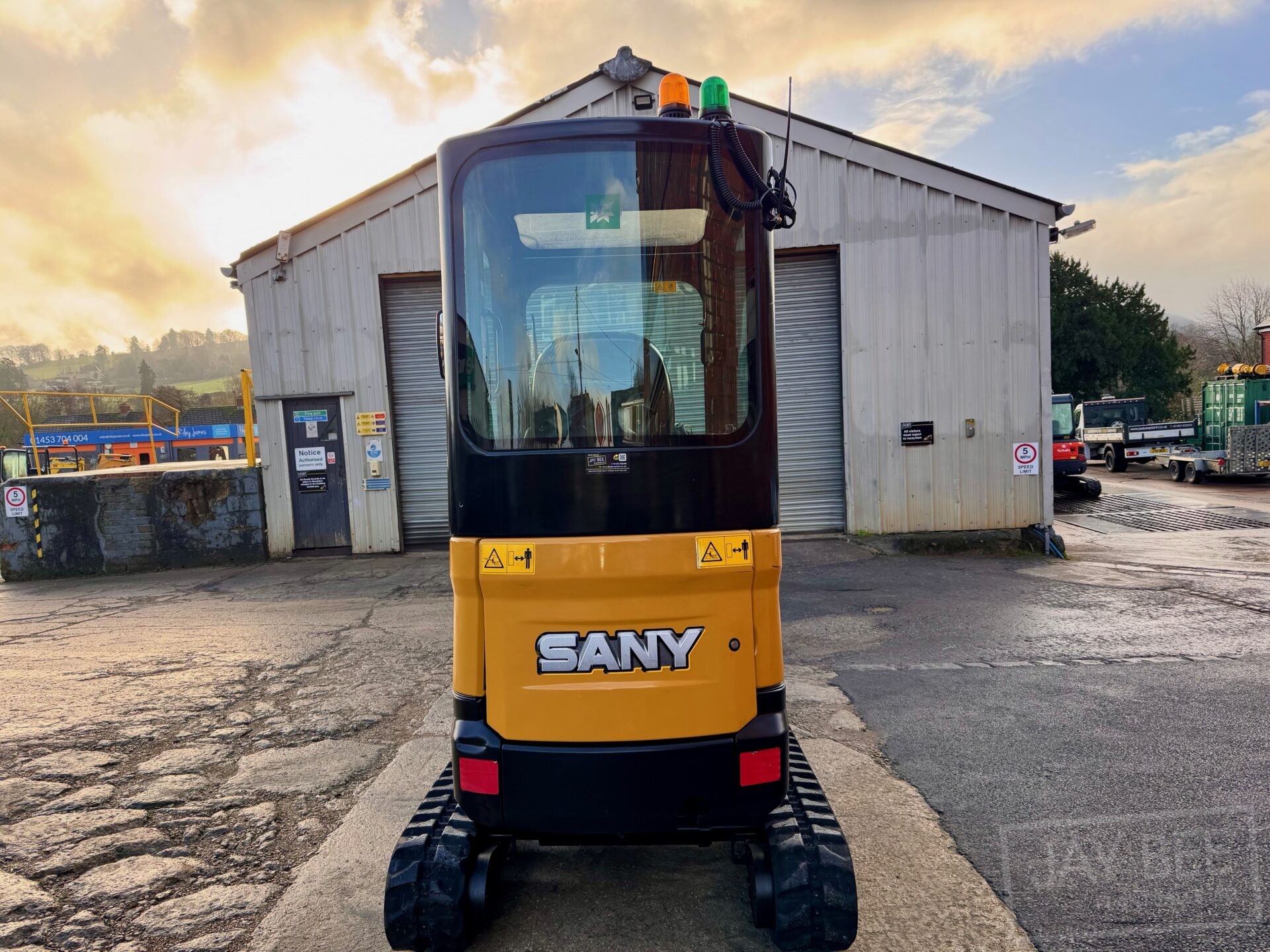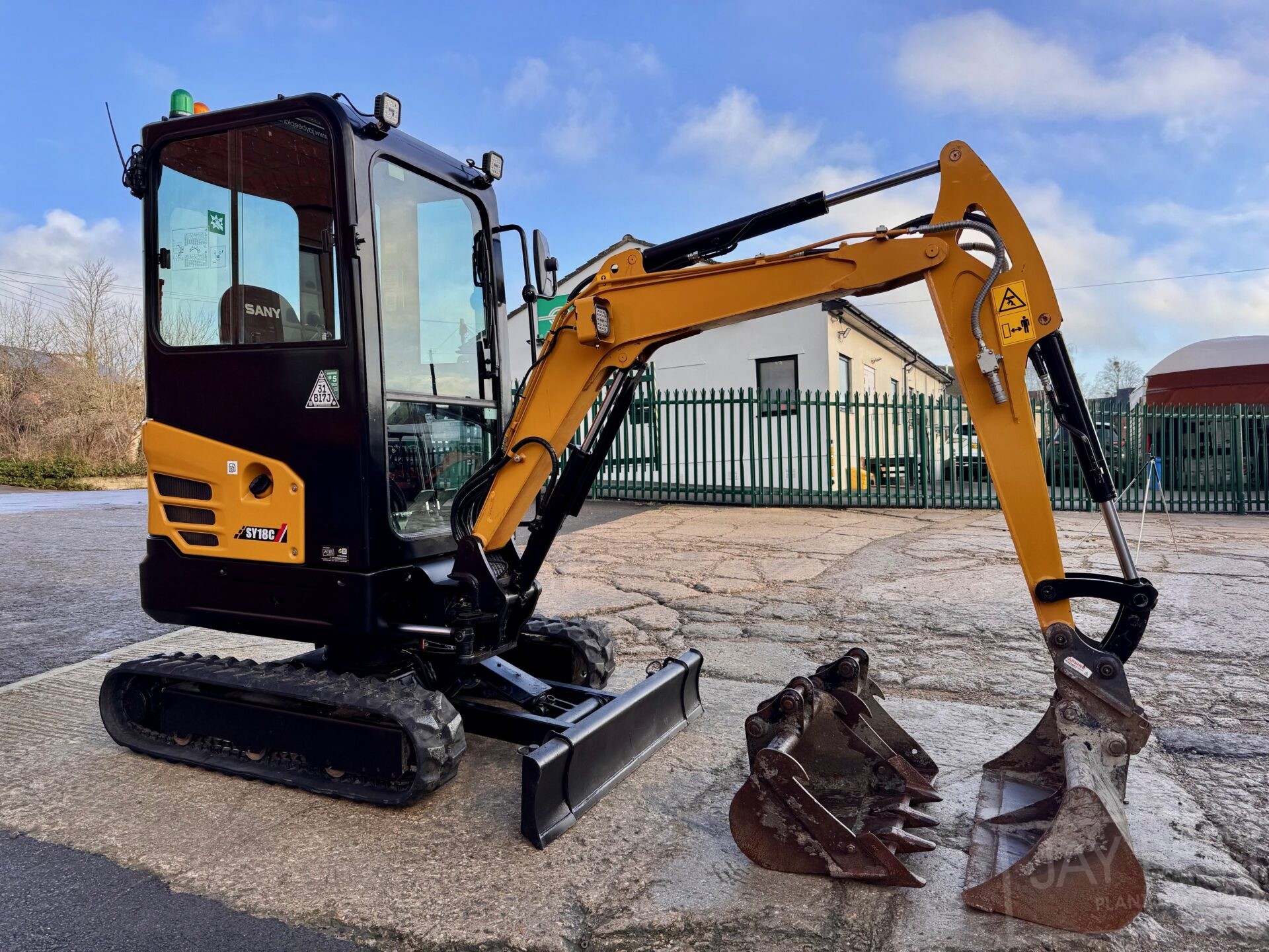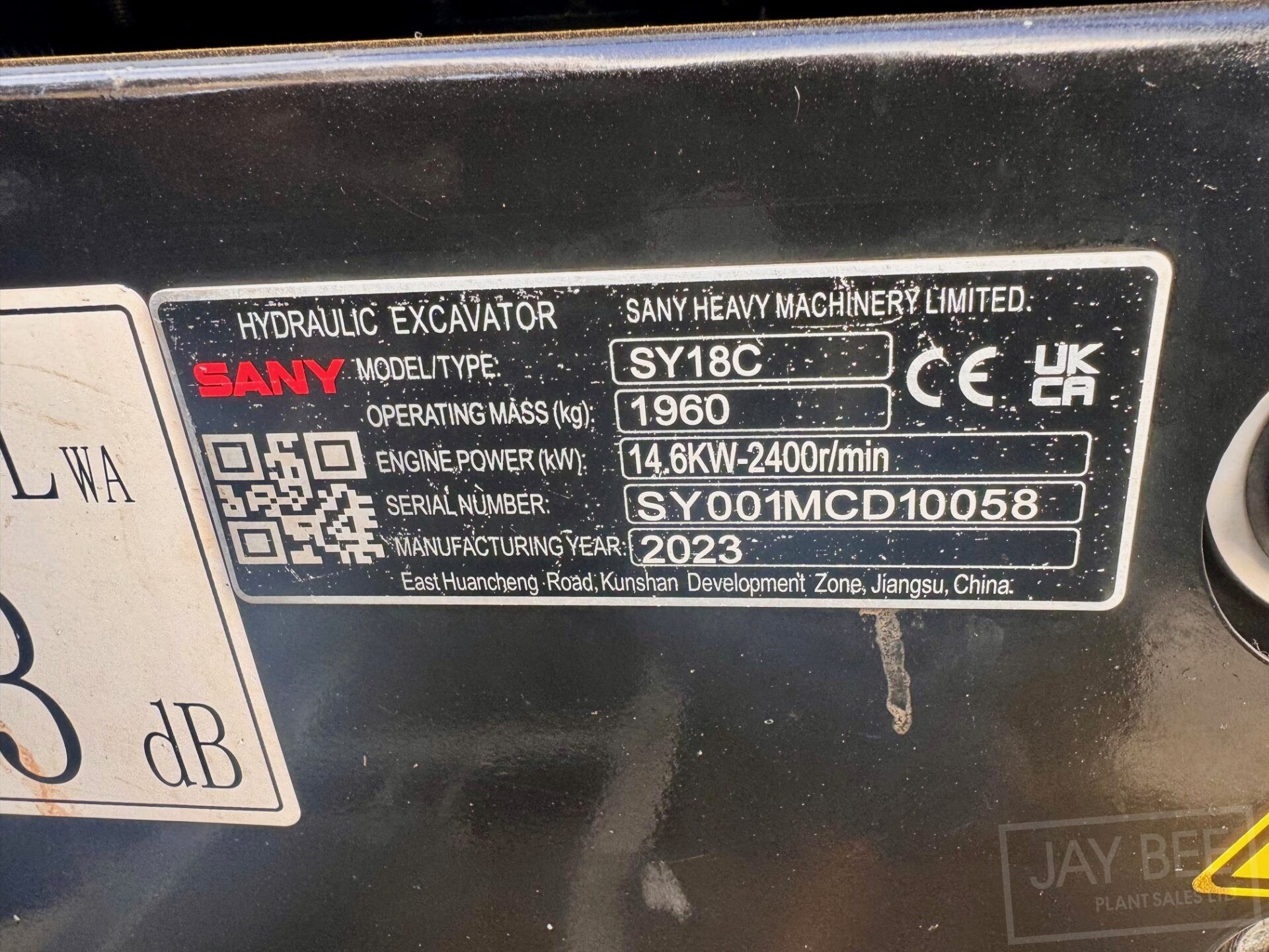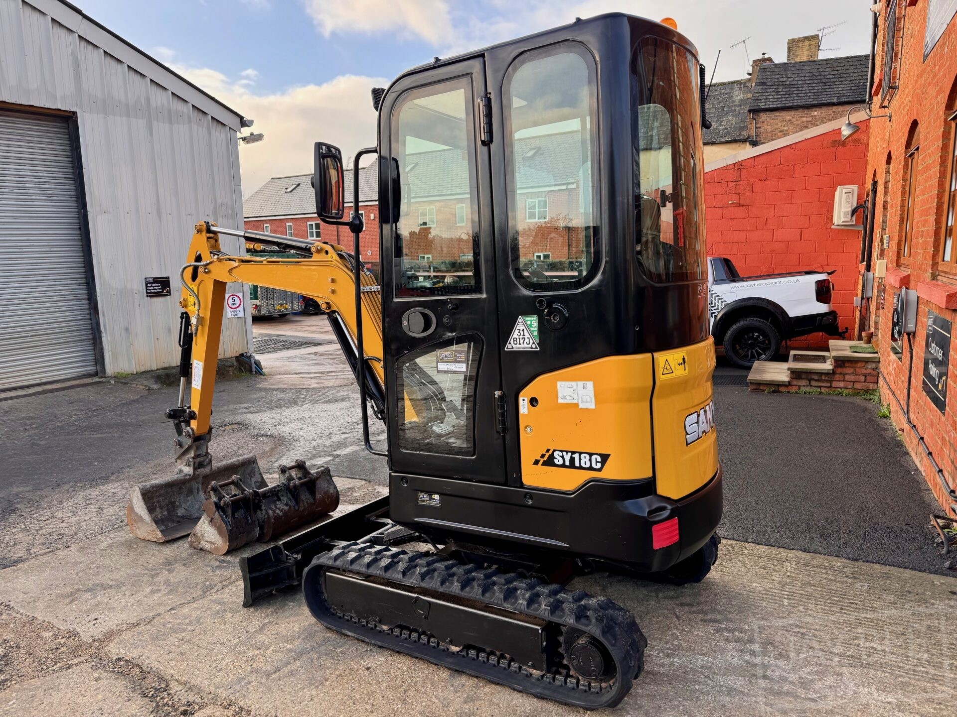 2023 Sany SY18C cabbed excavator with heater & radio, 2 speed tracking with travel alarm, expanding undercarriage, quick hitch & 3 buckets, green & orange beacons.