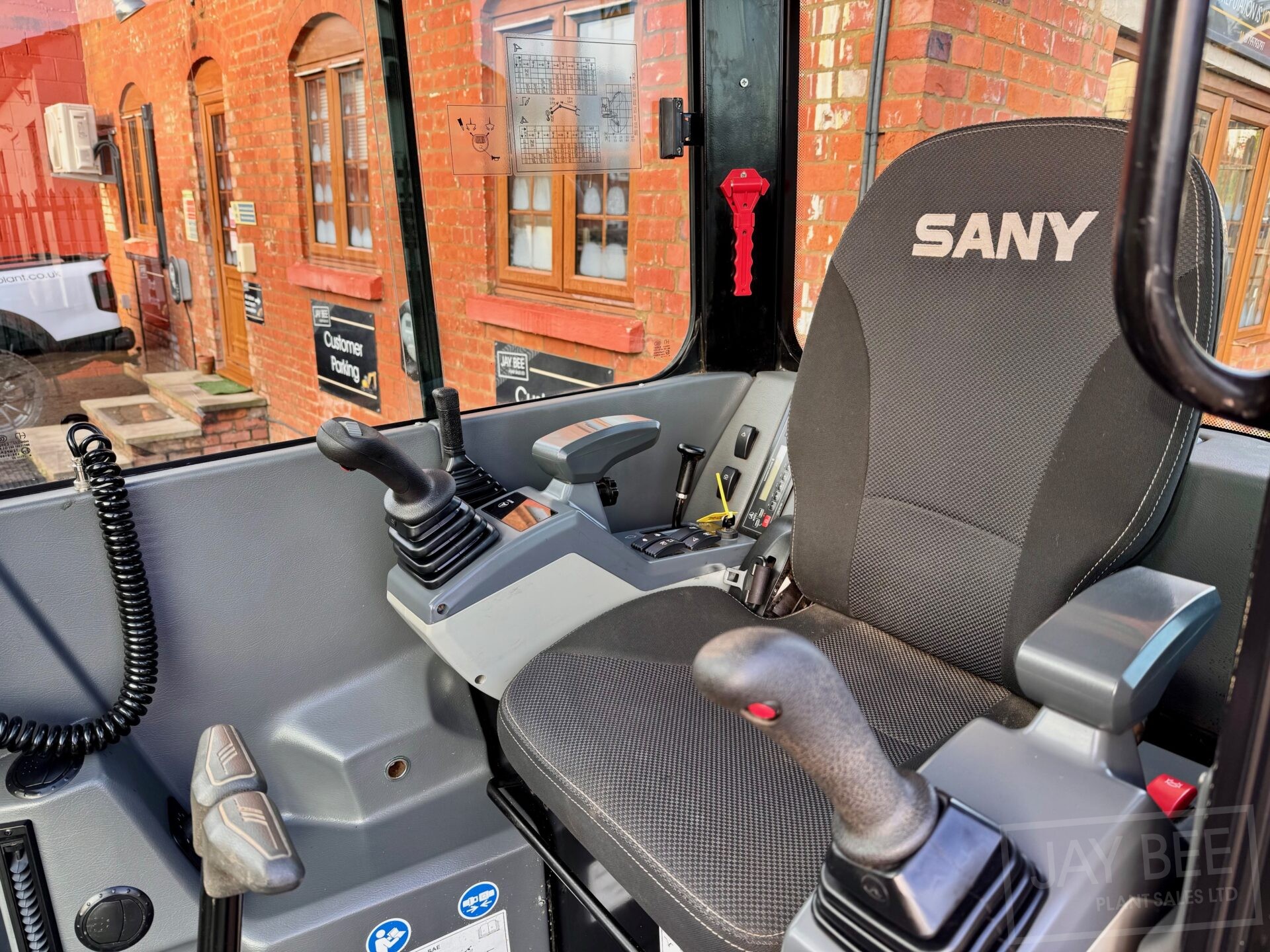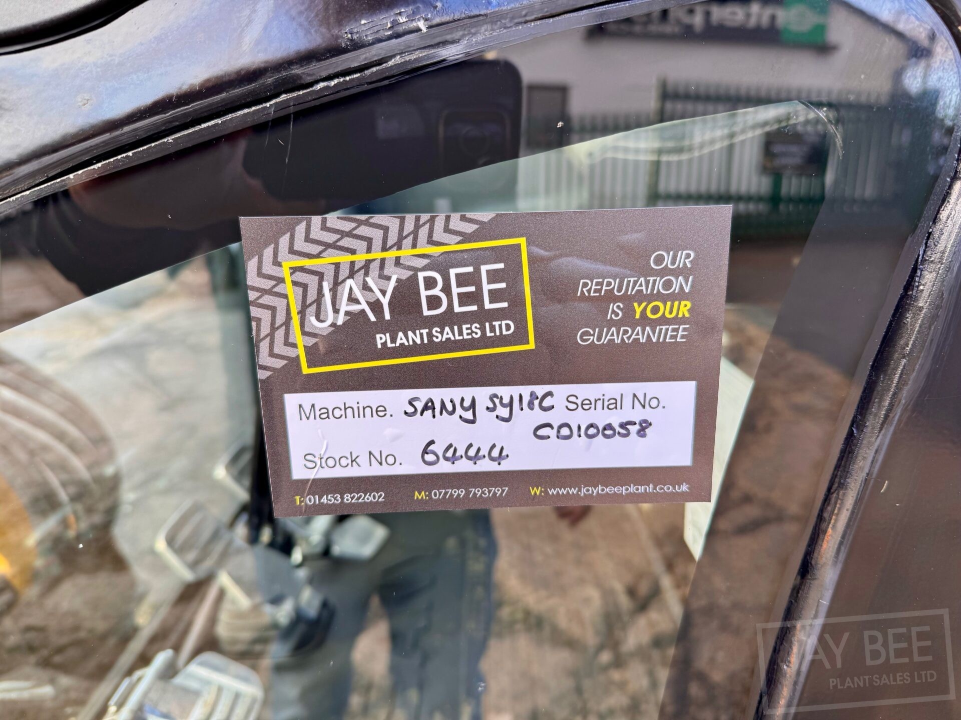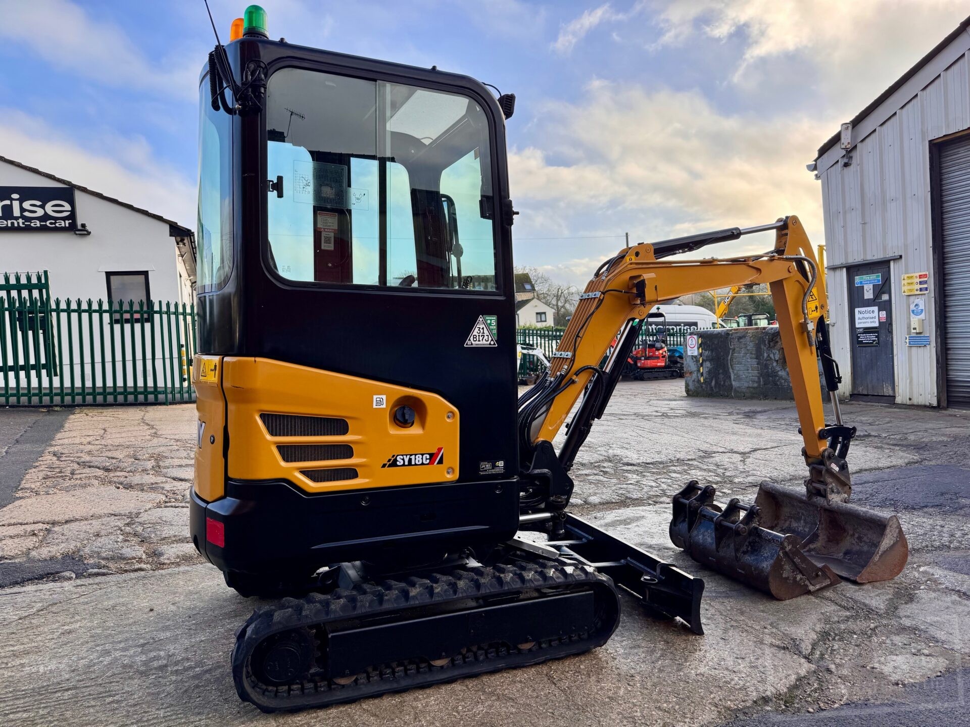 2023 Sany SY18C cabbed excavator with heater & radio, 2 speed tracking with travel alarm, expanding undercarriage, quick hitch & 3 buckets, green & orange beacons.