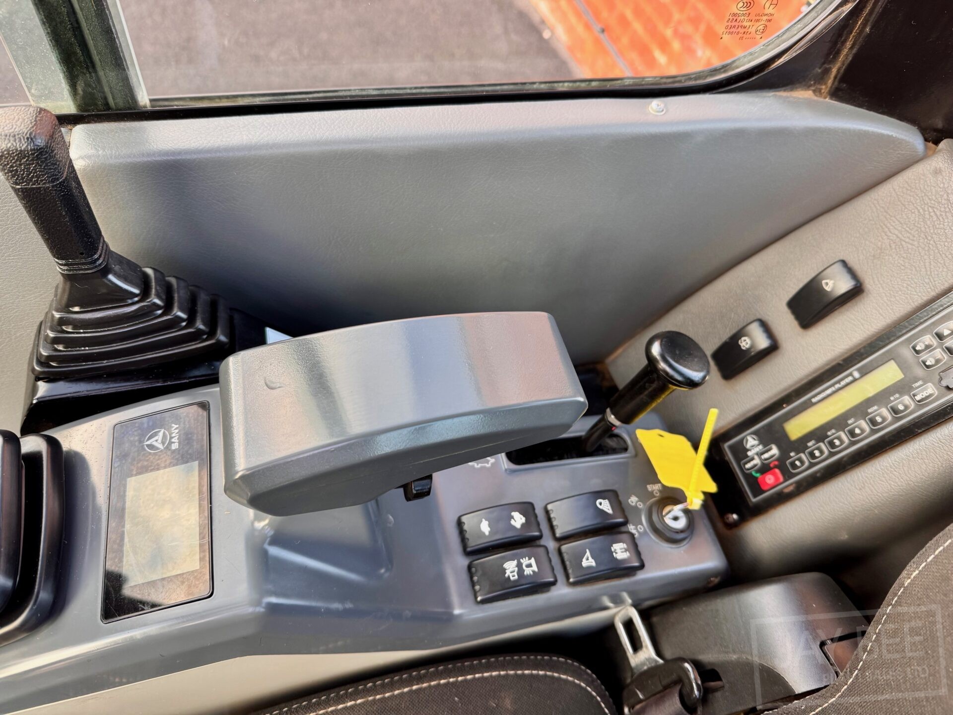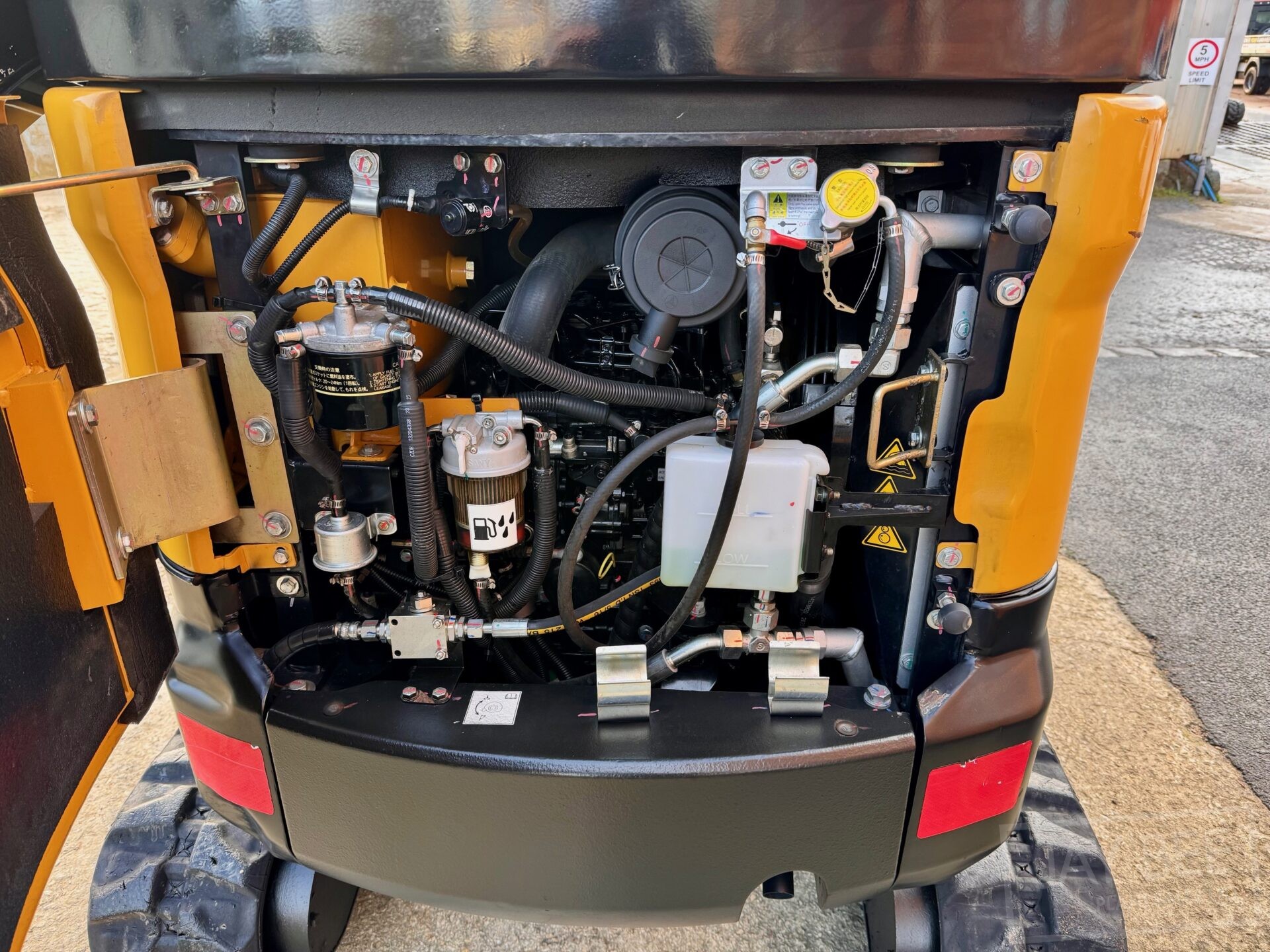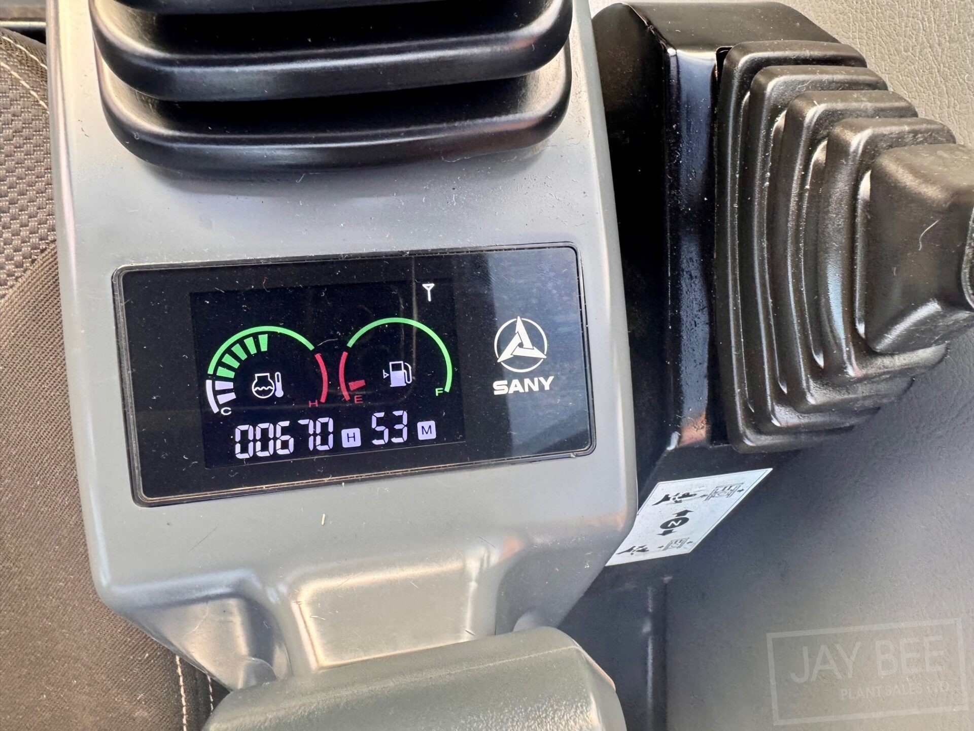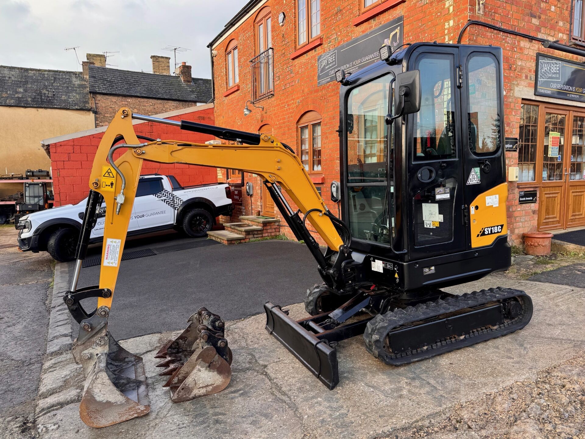2023 Sany SY18C cabbed excavator with heater & radio, 2 speed tracking with travel alarm, expanding undercarriage, quick hitch & 3 buckets, green & orange beacons.