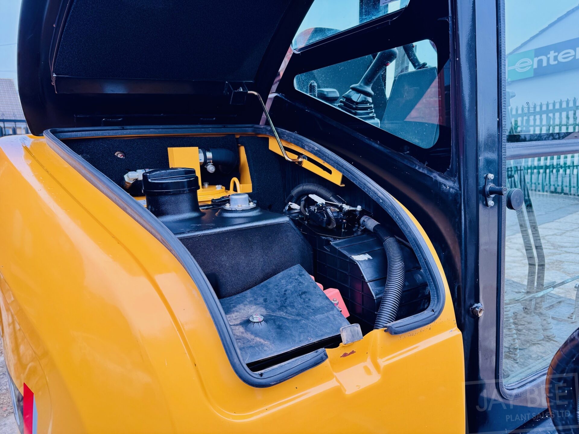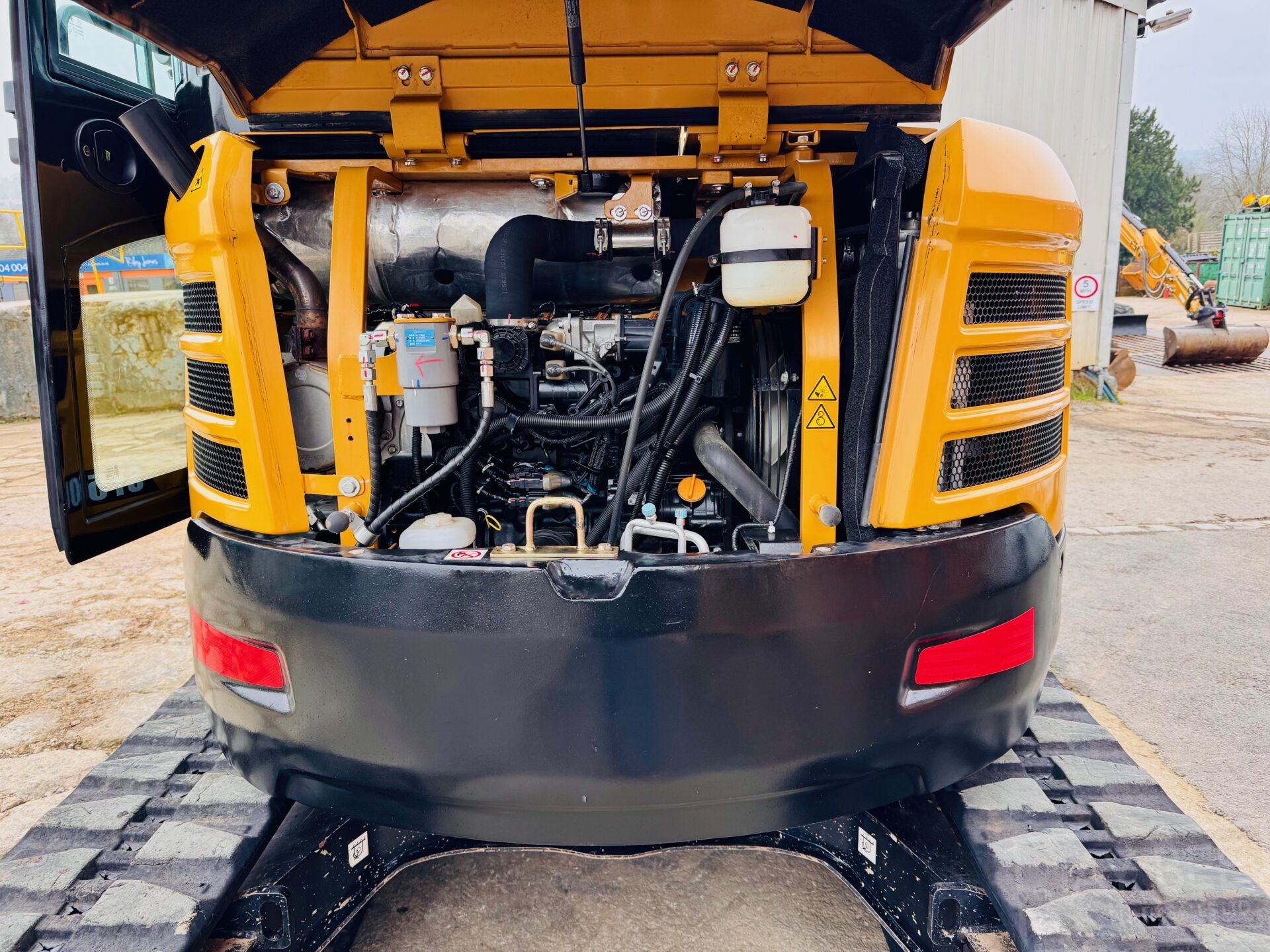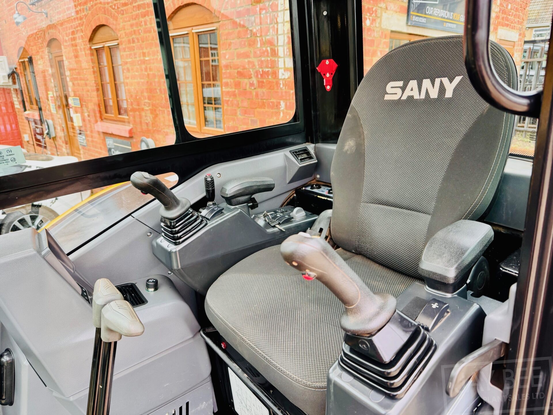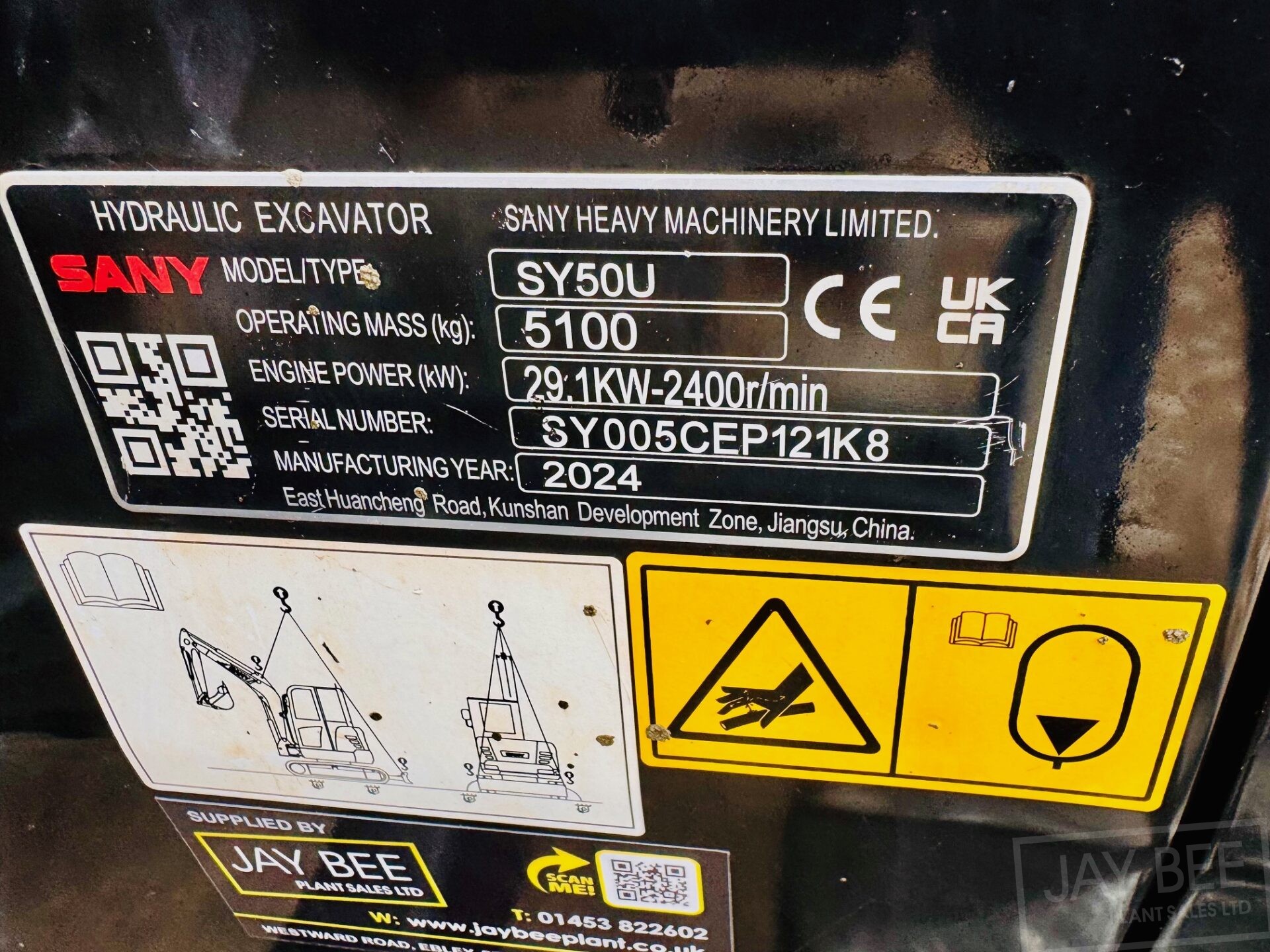 2024 Sany SY50U zero tail swing excavator with hydraulic quick hitch & 3 buckets, air con and piped to take rotating grab, radio and cab heater.
